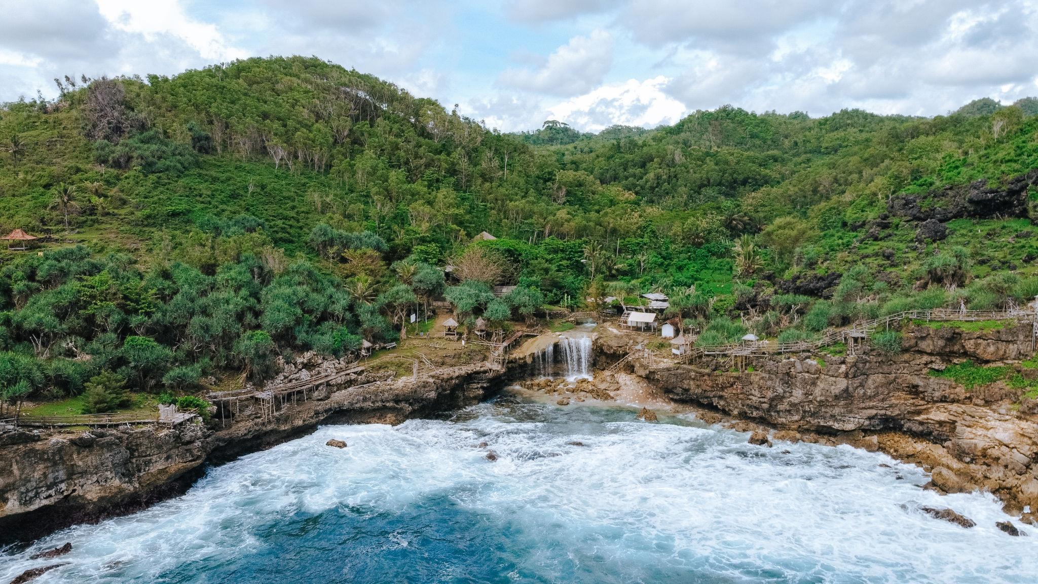Pengunjung dapat menikmati panorama langka berupa air terjun yang langsung mengalir ke laut dari atas tebing. Spot ini sangat populer bagi wisatawan yang ingin merasakan suasana alam yang masih alami.